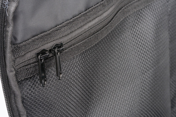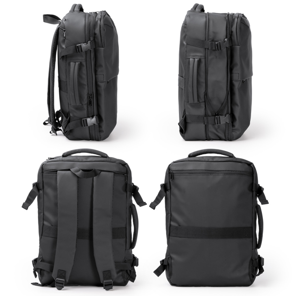 Erweiterbarer Rucksack aus PU-Leder mit Vakuumkompression dank seiner 30-W-Elektropumpe. Verfügt über ein Hauptfach mit zwei separaten Innentaschen, beide mit Reißverschluss, aus Netzgewebe. Außen verfügt er über eine obere Tasche mit einem Fach für Laptops bis zu einer Größe von 17 Zoll sowie eine verdeckte Tasche mit Reißverschluss. Mit verstellbaren Schnallen an den Seiten und Koffergurt. Gepolsterter Rücken und Schulterriemen.