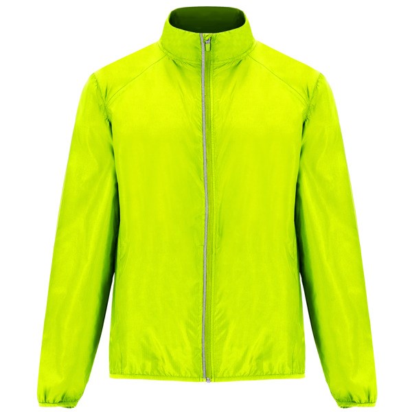 Leichte und atmungsaktive Unisex-Windjacke. Umgekehrter Frontreißverschluss mit reflektierendem Detail. Seitentaschen mit umgekehrten Reißverschlüssen und zwei Innentaschen. Ton-in-Ton-Bündchen mit elastischem Saum. Reflektierendes Detail auf der Rückseite.