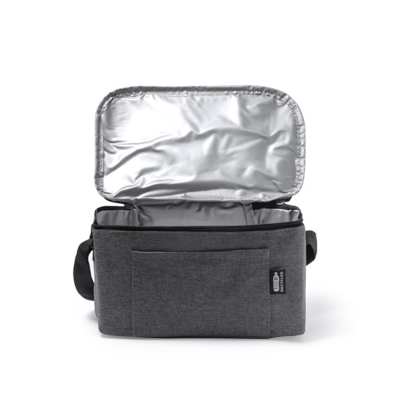 Kühltasche aus RPET-Polyester in meliertem Design. Isothermisches Futter und Fronttasche. Halten Sie Ihre Getränke und Lebensmittel kühl und tragen Sie sie überall hin.
