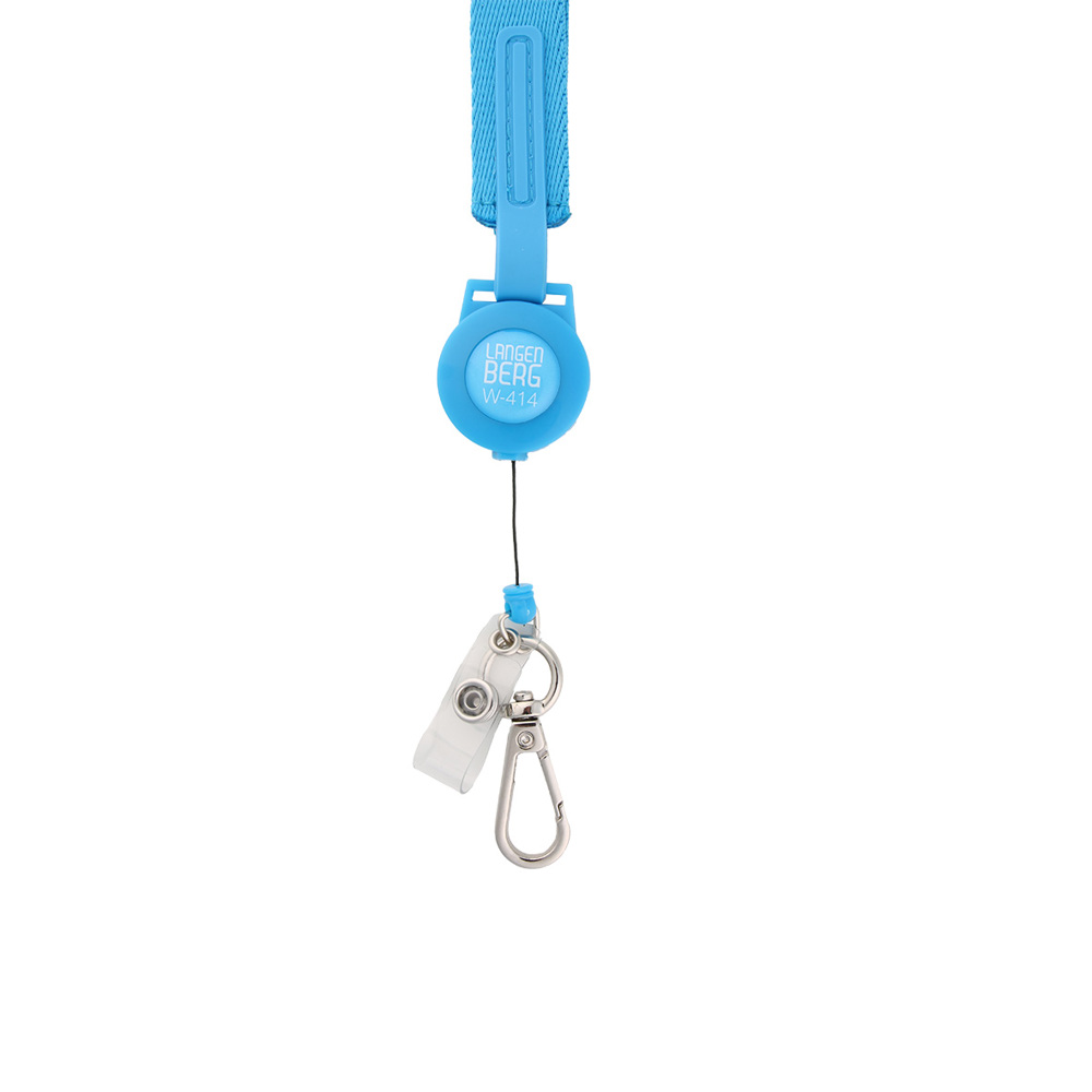 Ausstattung: Karabiner A-218, Ausziehbare (56 cm lang) Ausweishalterung D-303, PVC Schlaufe D-705, Sicherheitsverschluss C-107, Farbe des Bandes ähnlich Pantone möglich