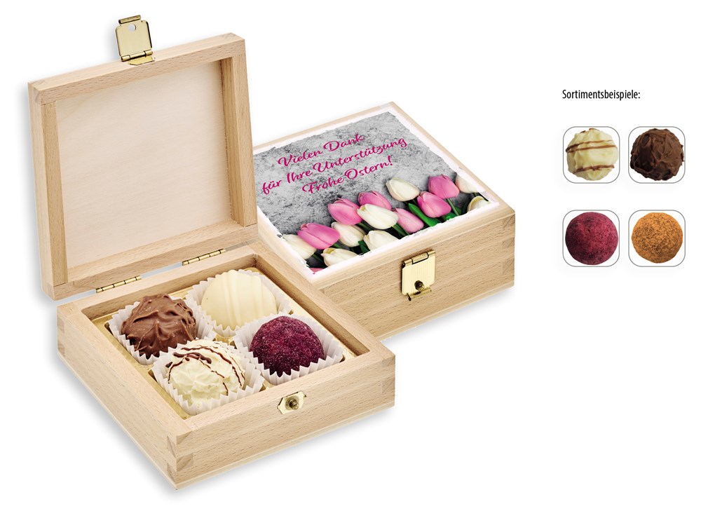 4er Pralinen-/Trüffelmix in Holzbox 4 Stück , Inhalt: Pralinen/Trüffel mit Alkohol