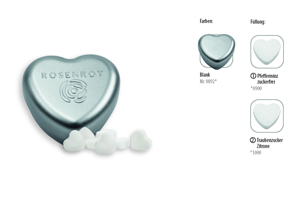 Echte Herzensangelegenheiten werden versüßt durch die Metalldose in Herzform. Diese überzeugt mit einer Füllung aus wahlweise zuckerfreien Pfefferminzherzen oder Traubenzuckerherzen mit Zitronengeschmack. Das Motiv wird auf den Deckel der Dose geprägt. ,