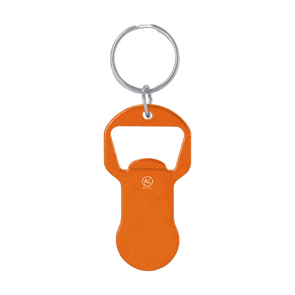 Recycelter Aluminium-Münzöffner-Schlüsselanhänger mit glänzendem Metallfinish. Oben funktioniert ein Flaschenöffner und unten integrierte Münze für doppelte Funktionalität. Enthält das Logo von recyceltem Aluminium.