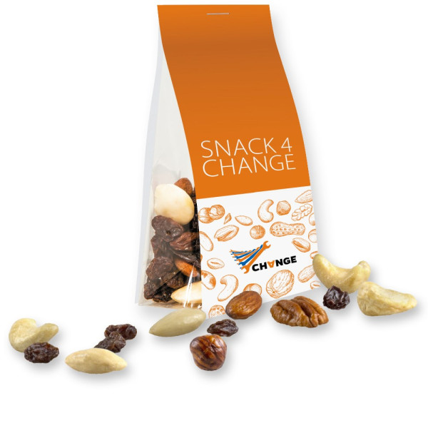 Studentenfutter, ca. 40g, Express Blockbodenbeutel mit Werbereiter