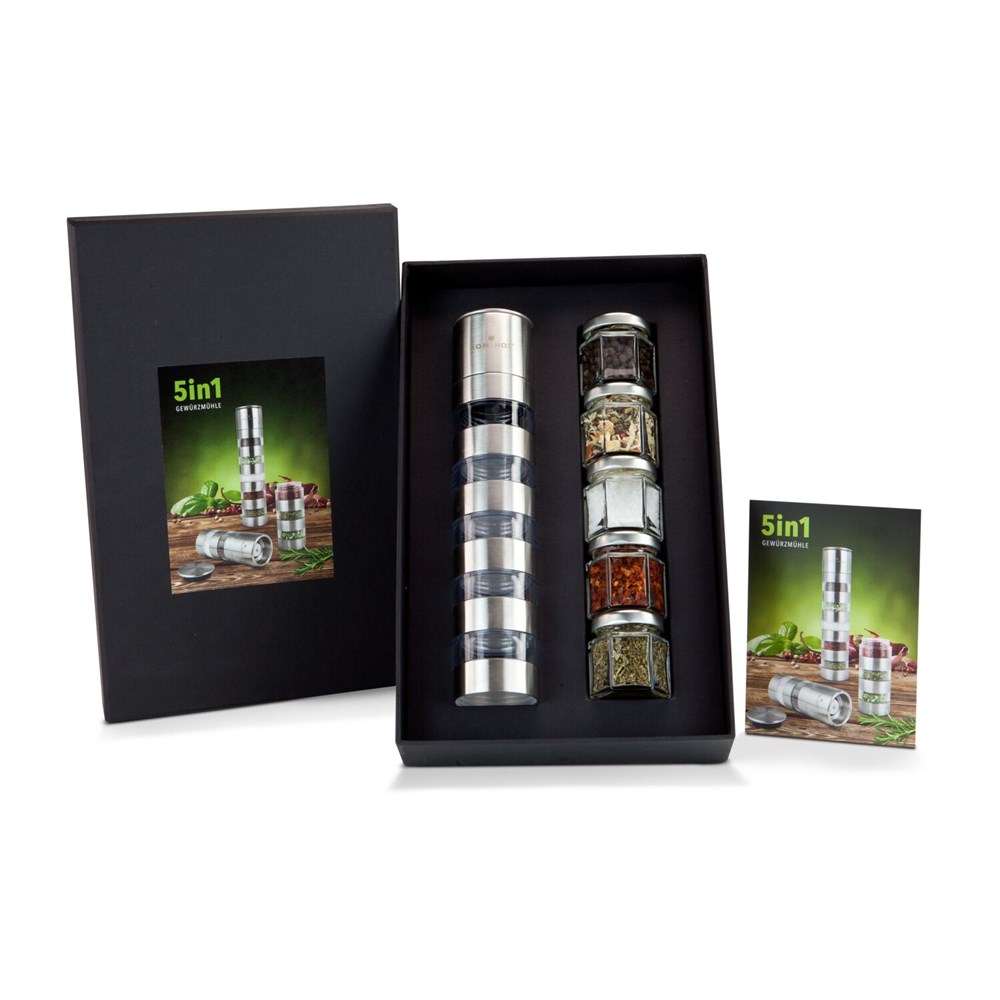 Diese clevere Gewürzmühle mit Keramikmahlwerk von ROMINOX® bietet Platz für 5 verschiedene Gewürze - die Erstausstattung ist gleich mit im Set: ca. 10 g Toskana Mischung, 7 g italienische Kräuter, 15 g geschrotete Chili Schoten, 40 g Salz, 20 g Pfefferkörner. Alles ist verpackt im schwarzen Geschenkkarton, inkl. Einleger mit Beschreibung der Mühle. Viel Spaß beim Würzen!