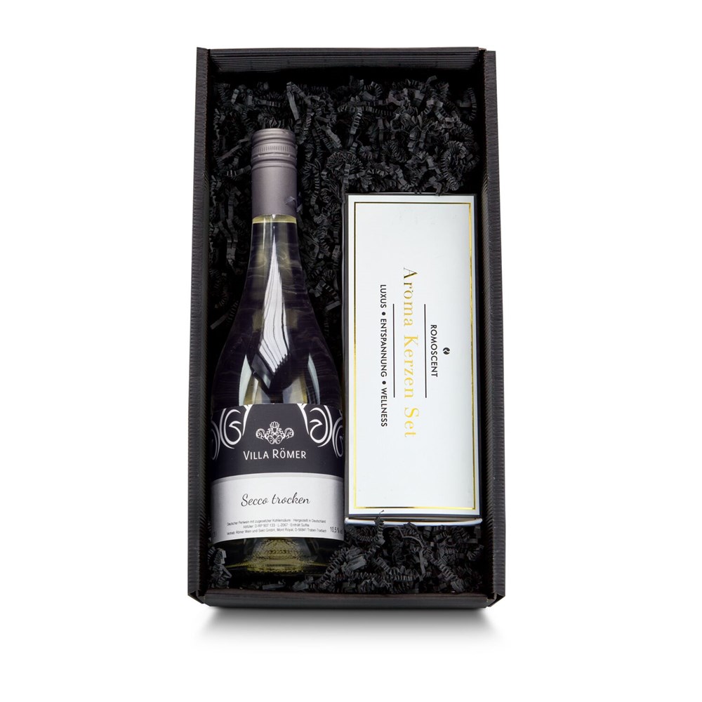 Eine besonders edle Kombination für einen privaten Zen-Moment zu Hause. Entspannen Sie bei einem Glas Secco im Kerzenschein. Dafür enthält der schwarze Geschenkkarton mit Sichtfenster einen hochwertigen Secco aus deutschem Anbau, mit einer harmonischen Kombination aus spannendem Süße-Säure-Spiel und belebender, feinperliger Kohlensäure (0,75 l) und ein Aromakerzen-Set mit 3 angenehm nach Vanille duftenden Kerzen. Die edlen Kerzen sind mit einer Schleife versehen und kommen jeweils in einem weißen Glas mit goldenem Aufdruck: Feel - Relax - Enjoy!