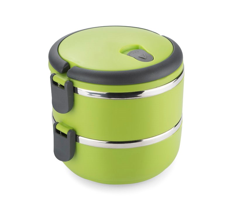 Ein Behälter mit Innenraum aus Edelstahl, der in zwei Kammern unterteilt ist, eine auf die andere gelegt, was wiederum eine handliche und bequeme Verbringung von 2-Gänge-Gerichten ermöglicht. Die obere Kammer ist mit einer Dichtung ausgestattet. Einklappbare Kunststoffgriffe. Gesamtfassungsvermögen: 1400 ml.