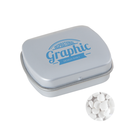 Kleine Scharnierblechdose mit ca. 10 g extra starken, zuckerfreien Dreiecks-Minzbonbons