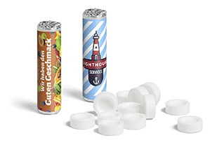 9 Fruchttabletten zuckerhaltig, verpackt in individuell bedruckter Papierbanderole. mehr