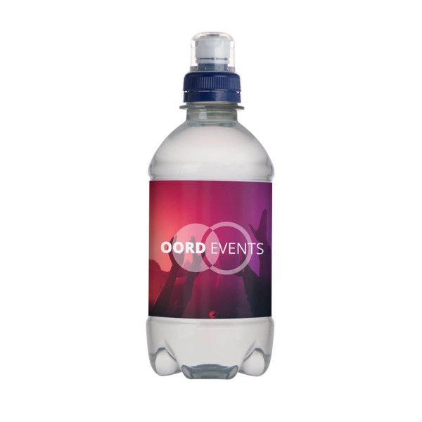 330 ml Quellwasser in einer transparenten Flasche mit Sportverschluß, Flasche aus 100% recyceltem Plastic (R-PET), inklusive Kunststoff Etikett rundum