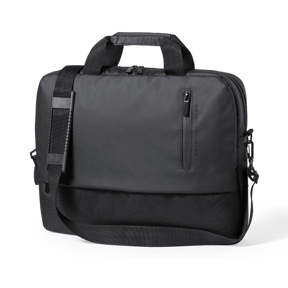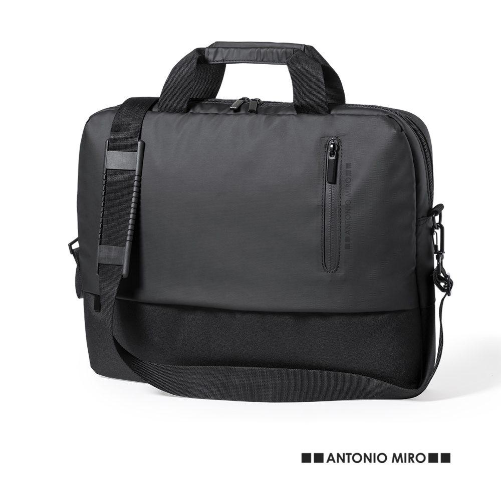 Hochwertige Antonio Miro Aktentasche aus strapazierfähigem 600D Polyester. Mit schlichtem Design und gepolstertem Laptopfach für Laptops bis zu 15 Zoll. Mit komfortablem, verstärktem Tragegriff, Reißverschlüssen mit Metallziehern und Fronttasche. Markenlogo auf der Vorderseite.