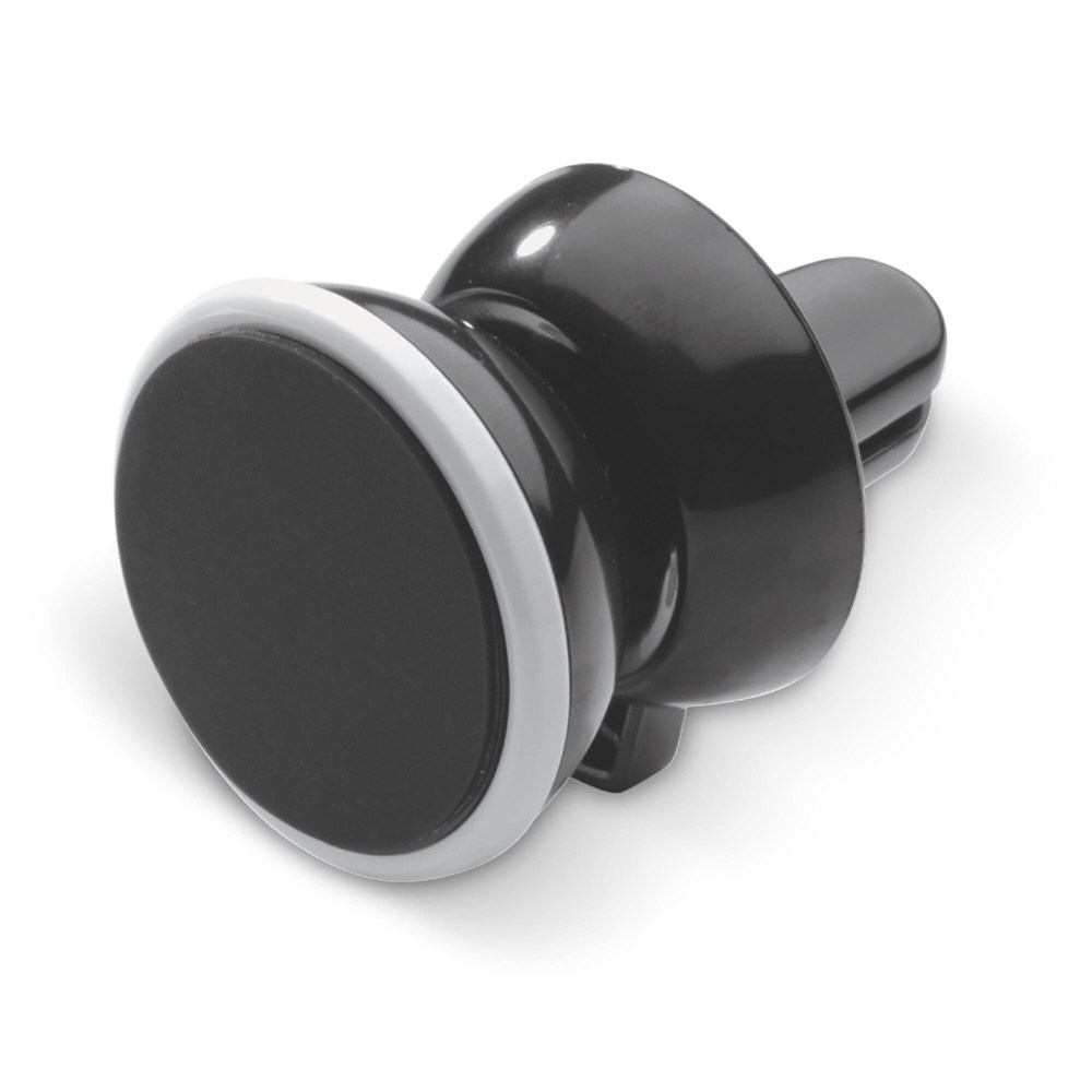 Magnetischer Handyhalter aus zwei Teilen: eine Metallplatte mit Aufkleber zum Anbringen auf der Rückseite des Handys und einem magnetischen Halter für das Lüftungsgitter im Auto. Nutzen Sie die Lüftung als Handyhalter.