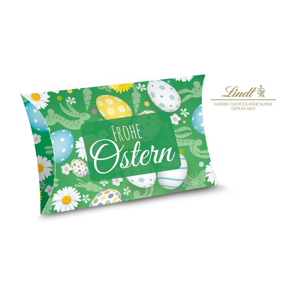Dieses kleine originelle Osternest kommt in einer Kissenverpackung, auf Wunsch individuell bedruckt mit Ihrem Design. Im „Nest“ sitzt 1 Lindt-Goldhase (10 g) umgeben von 5 gewickelten Lindor-Mini-Eiern (je 4,6 g) in verschiedenen Sorten auf frischem, grünen Sizzle. Wählen Sie zwischen der Standardverpackung ab 1 Stück oder einer individuellen Gestaltung.