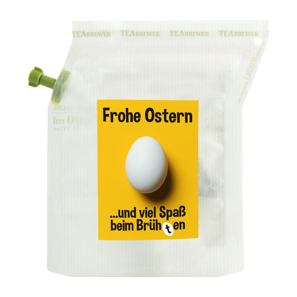 Verschenken Sie Fröhlichkeit und Genuss zur Osterzeit: kleines Präsent, große Wirkung - und das im Frühling! Mit diesen hübschen Brühbeuteln lässt sich die Hektik des Alltags schnell vergessen. Einfach heißes Wasser einfüllen, ziehen lassen, durch den integrierten Filter ausgießen und genießen. Kein Instant-Produkt! Pure Osterfreude. Ideal auch für das Büro oder für unterwegs. Ein Beutel ergibt zwei Tassen und kann wiederverwendet werden. Erhältlich mit 6 verschiedenen Oster-Aufklebern. Herstellung 100% CO2 neutral (WeForest validiertes Baumpflanzungs-Projekt + UN kontrolliertes REED Kohlenstoffkompensationsprojekt) und Plastik neutral (Plastic Bank® zertifizierter Ausgleich durch das Sammeln von im Meer befindlichem Plastik) und mit Windenergie.