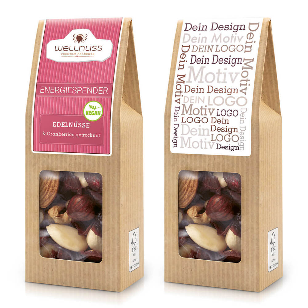 Ab 250 Stück mit Ihrem Motiv im 4c Druck auf dem Etikett der Faltschachtel, ab 2.500 Stück bedrucken wir den Faltschachtelkarton vollflächig: Der aufmerksamkeitsstarke Bestseller. Die Faltschachtel als nachhaltiges Premium-Giveaway. Süßliche Cashews, herbe Mandeln und aromatische Walnüsse spielen mit der leichten Säure schonend getrockneter Cranberries. Diese Snack-Komposition ist vegan, laktosefrei und glutenfrei.