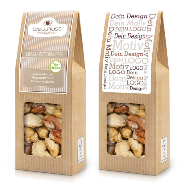 Ab 250 Stück mit Ihrem Motiv im 4c Druck auf dem Etikett der Faltschachtel, ab 2.500 Stück bedrucken wir den Faltschachtelkarton vollflächig: Der aufmerksamkeitsstarke Bestseller. Die Faltschachtel als nachhaltiges Premium-Giveaway. Genuss in seiner natürlichsten Form - Eine natürliche Komposition aus der süßlichen Note naturbelassener Cashewkerne und Pekannüsse, abgerundet durch den Geschmack von aromatischen Walnüssen – dieser Snack ist Natur pur. Diese Snack-Komposition ist vegan, laktosefrei und glutenfrei.