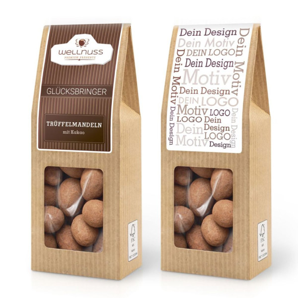 Ab 250 Stück mit Ihrem Motiv im 4c Druck auf dem Etikett der Faltschachtel, ab 2.500 Stück bedrucken wir den Faltschachtelkarton vollflächig: Der aufmerksamkeitsstarke Bestseller. Die Faltschachtel als nachhaltiges Premium-Giveaway. Ein Mandelkern, umhüllt von feinster belgischer Schokolade, bedeckt mit einem Hauch Kakaopulver. Die Kombination aus fein-herben Kakao mit zart-schmelzender Schokolade und einer knackigen Mandeln ist einfach unwiderstehlich.
