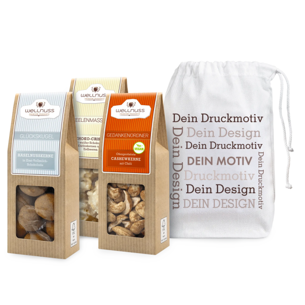 Ab 100 Stück mit Ihrem Motiv auf dem Baumwollsäckchen: Wählen Sie aus einem breiten Sortiment von edlen Nüssen, verführerischer Schokolade und Trockenfrüchten. Mit Liebe konfektioniert in Deutschland. Sie suchen eine andere Größe? Dieses Premium Präsent ist auch mit 1 oder 2 Faltschachteln erhältlich.