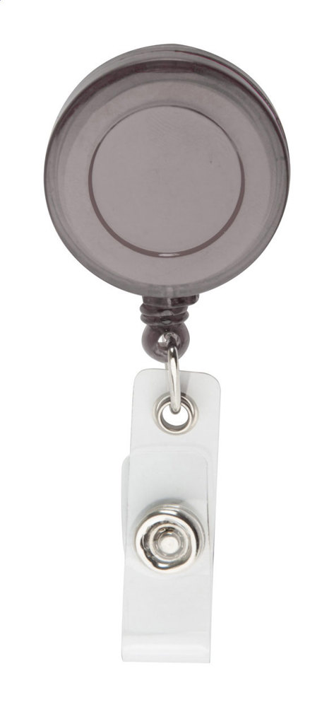 Ausweishalter mit Zugschnur und Druckknopf, aus transparentem Kunststoff.