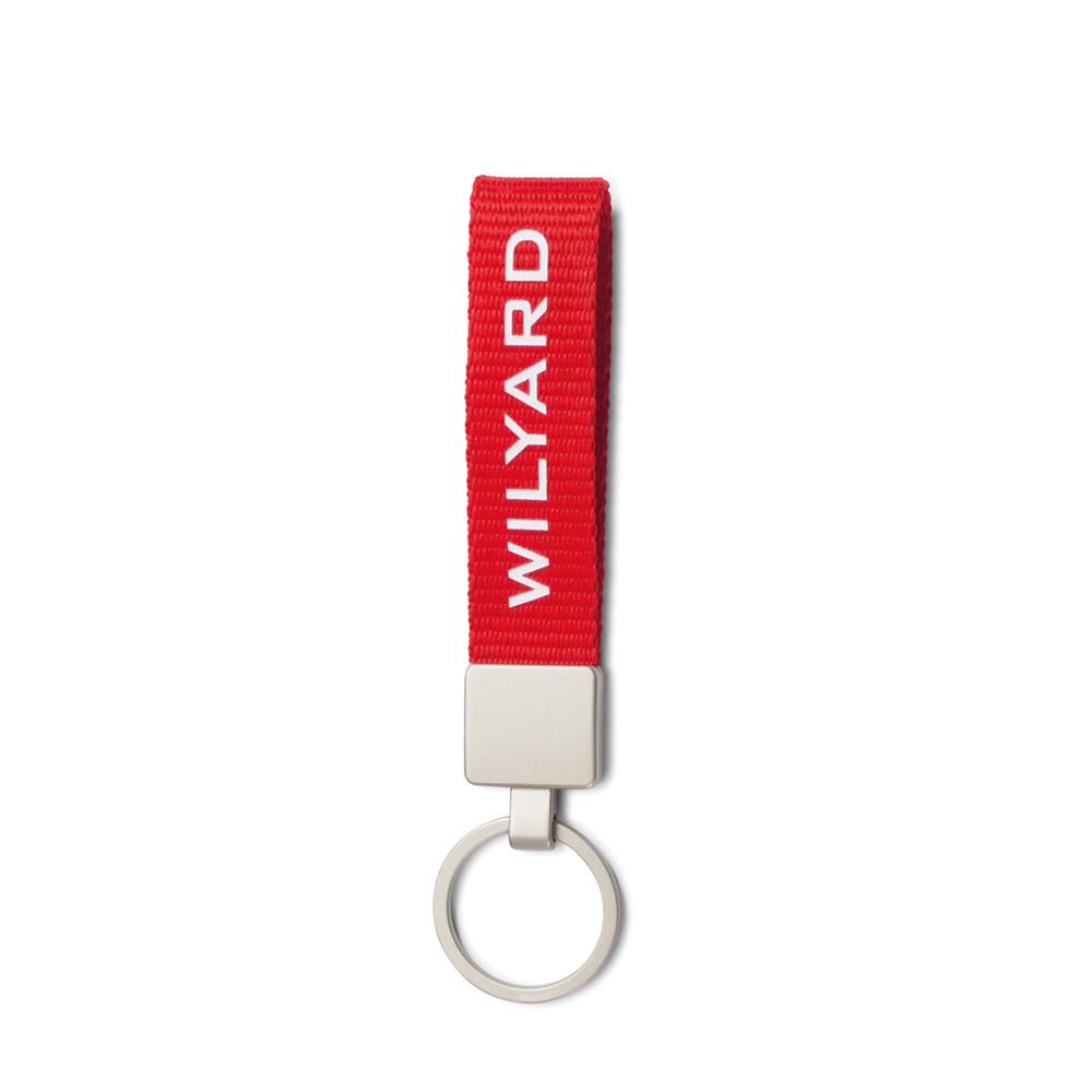 Ausstattung: Schlüsselring A-001 silber matt, Anschlussstück B-502 silber matt, Farbe des Bandes ähnlich Pantone möglich