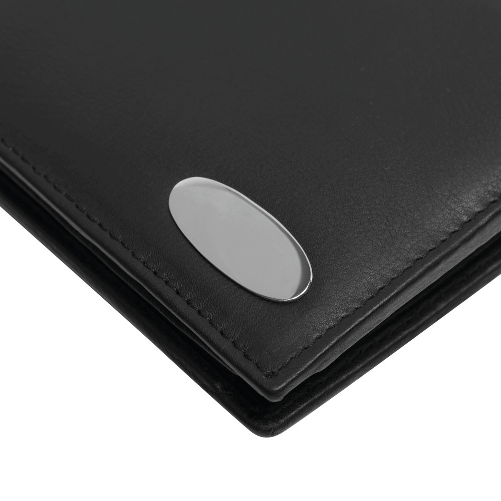 Echtleder-Geldbörse DAX: innen 6 Einsteckfächer für Geldkarten, 2 Geldscheinfächer, 1 Münzfach mit Druckknopfverschluss für Kleingeld, 1 Netzfach, 5 zusätzliche Fächer, 1 Fach für Einkaufswagen-Chip, außen mit ovaler Metallplatte für eine Werbeanbringung, in Box