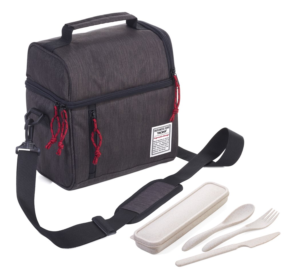 Isoliertasche inkl. Besteck-Set (Messer, Gabel, Löffel, Aufbewahrungsbox) aus 50% Weizenstroh/50% PP, zur Aufbewahrung von Essen & Getränken, hält über Stunden warm/kalt, Hauptfach mit isoliertem Reißverschluss und Thermo-Innenfutter aus hochwertiger Aluminiumfolie, Schlaufe zur Befestigung am Trolley, abnehmbarer, verstellbarer Schultergurt, Tragegriff, Fronttasche mit Reißverschluss, oberes Fach (ohne Isolierfunktion) für Besteck & Zubehör, Kapazität ca. 5 Liter, Tragkraft bis zu 10 kg, 100% Polyester, Aluminium, Polyester, Polypropylen, Weizenstroh, anthrazit/schwarz