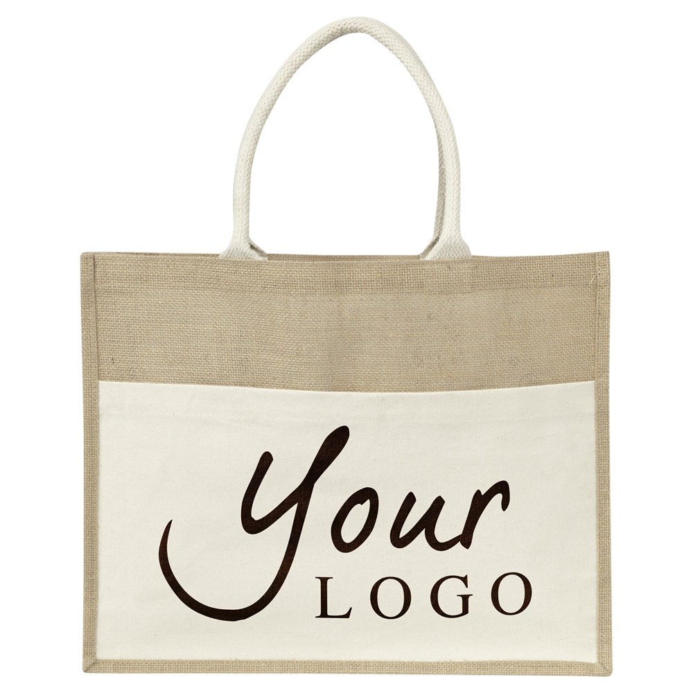 Shopper aus Jute, mit Frontfach, 9,5 cm Boden- und Seitenfalte und kurzen Henkeln.