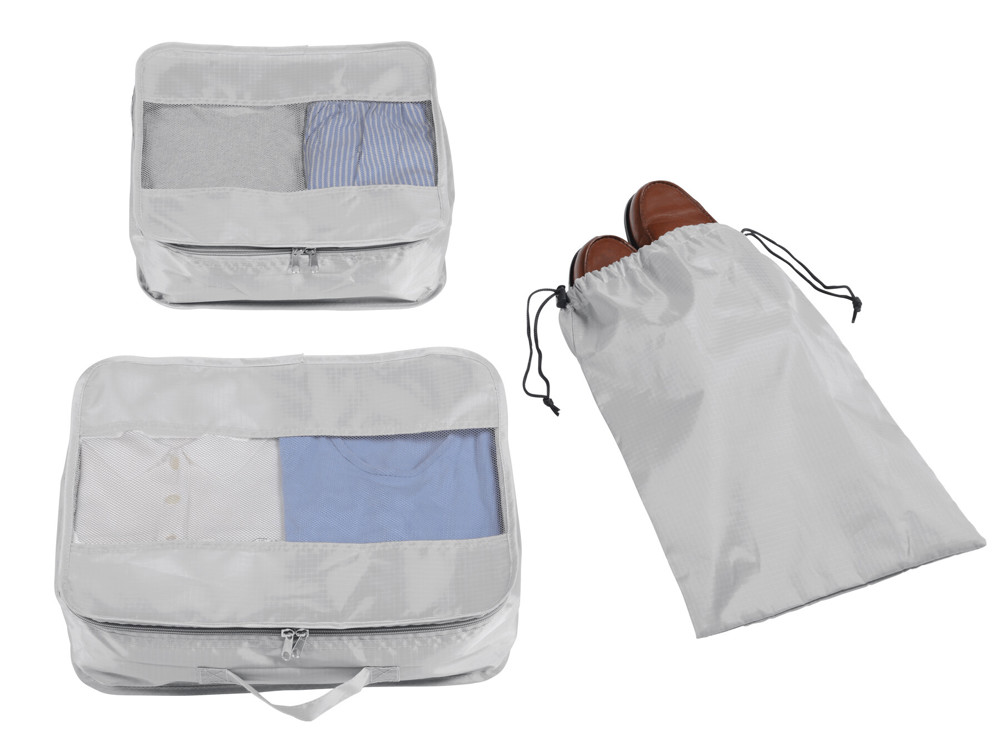 Reise-Set TRAVEL ATTENDANT, 3-teilig: bestehend aus 2 Kleidertaschen in unterschiedlichen Größen und 1 Schuhbeutel, Kleidertaschen mit Fenster aus Netzmaterial für eine leichte Einsicht und gute Belüftung, doppeltem Reißverschluss und die große Tasche hat zusätzlich einen Tragegriff, verschließbarer Schuhbeutel mit Kordelzugverschluss und 2 Kunststoffstoppern – für mehr Ordnung im Koffer