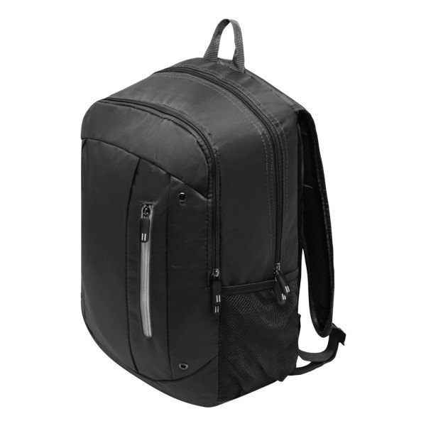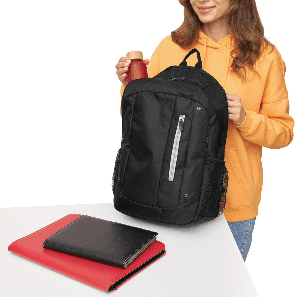 Rucksack TALLINN: 1 Reißverschluss-Vorfach mit Organizer, kleine vertikale Vortasche mit farbigem Reißverschluss, 1 Reißverschluss-Hauptfach mit gepolstertem Innenfach für Laptop oder Tablet plus extra gepolstertes Einsteckfach, 2 seitliche Netzfächer, Trageschlaufe, gepolsterte Schultergurte und Rückenbereich