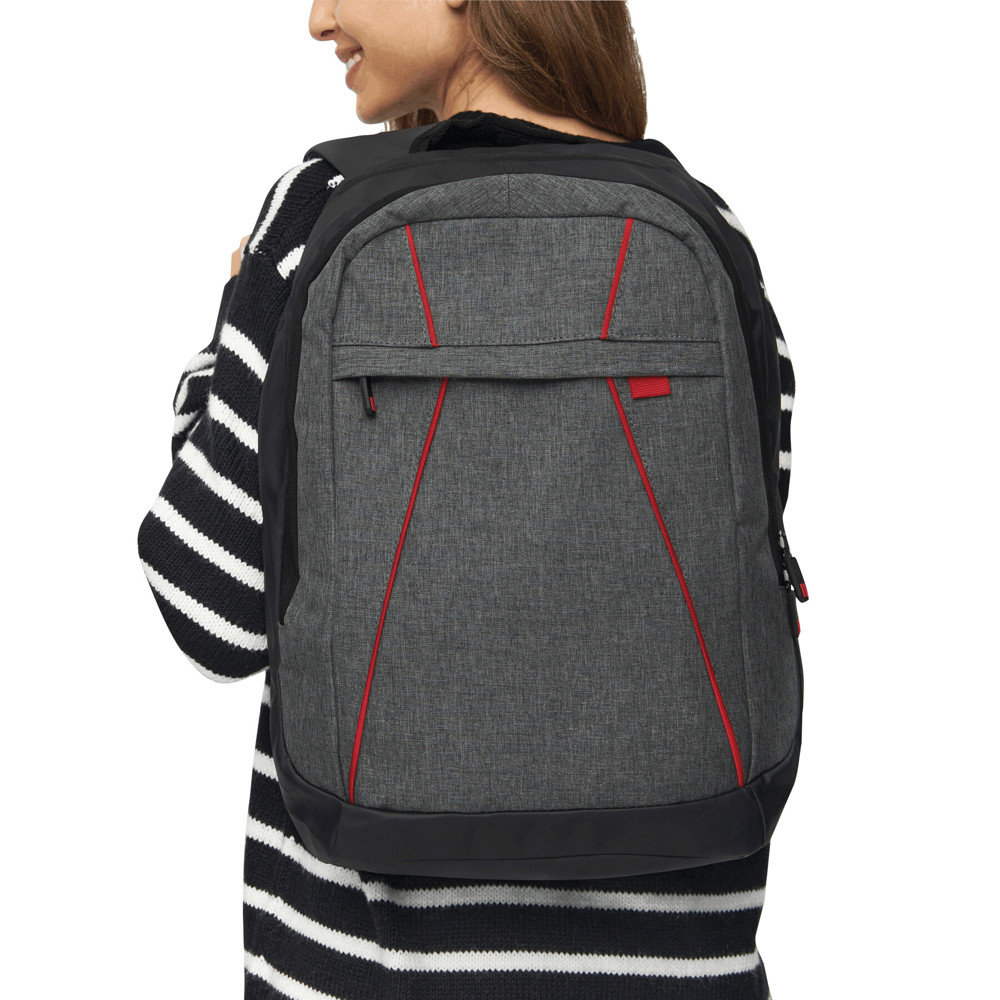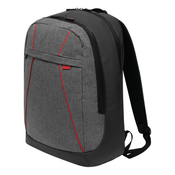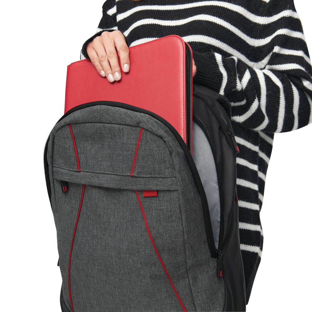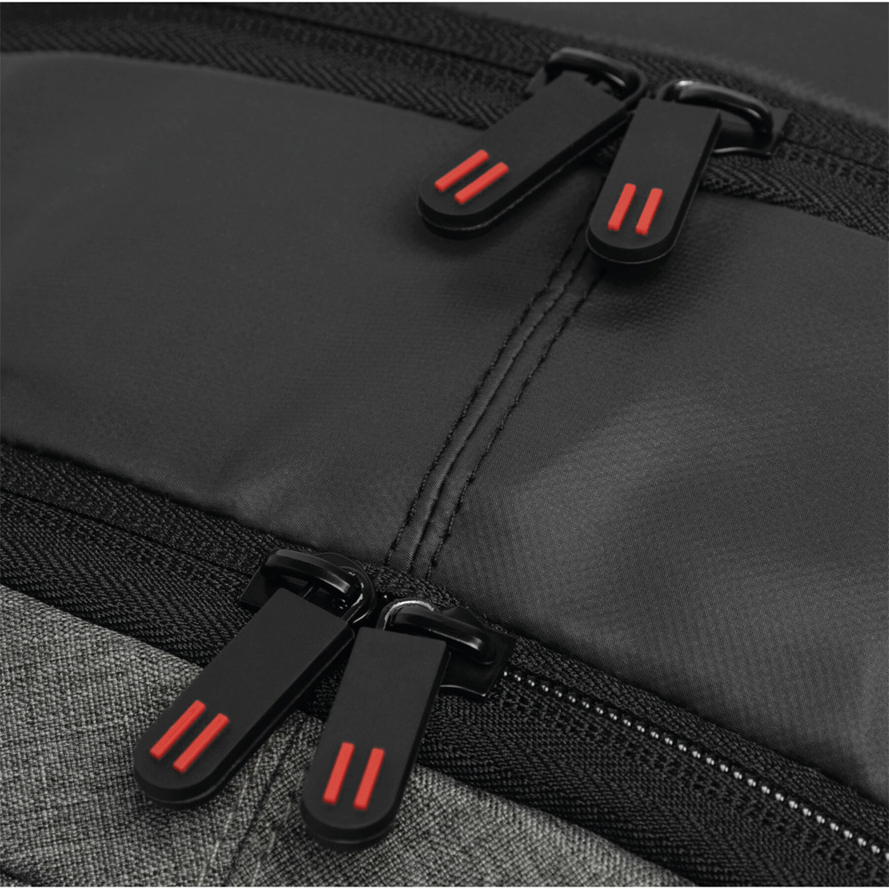 Rucksack SPLIT: 1 Reißverschluss-Vorfach, 2 Reißverschluss-Hauptfächer, ein Hauptfach mit gepolstertem Laptopfach und 1 Einsteckfach, das andere Hauptfach mit kleinem Organizer, Tragegriff, gepolsterte Schultergurte und Rückenbereich