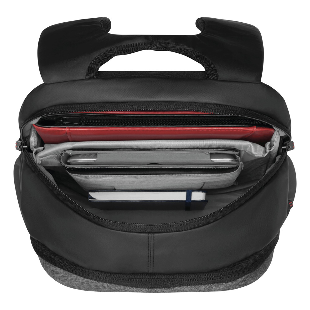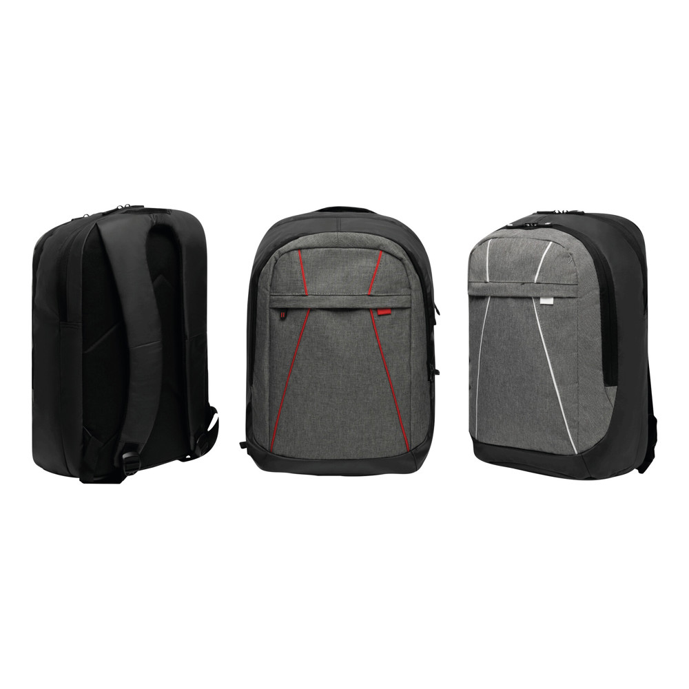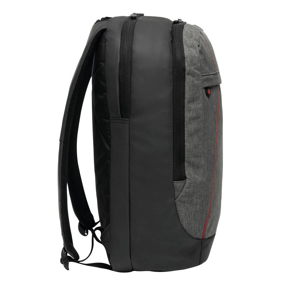 Rucksack SPLIT: 1 Reißverschluss-Vorfach, 2 Reißverschluss-Hauptfächer, ein Hauptfach mit gepolstertem Laptopfach und 1 Einsteckfach, das andere Hauptfach mit kleinem Organizer, Tragegriff, gepolsterte Schultergurte und Rückenbereich