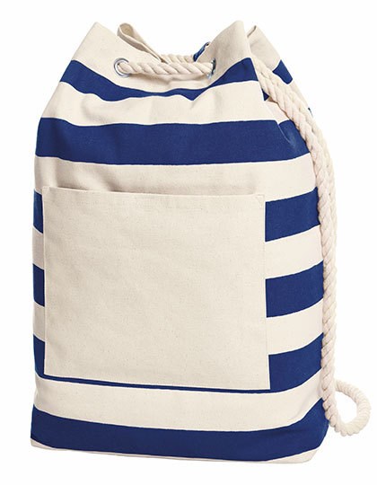 Junger Rucksack mit frischem Blockstreifen-Dekor | Großzügiger Schnitt mit geradem Rücken | Große Tasche vorne mit Klettverschluss | Dekorative Ösen und Träger aus dicker Baumwollkordel | Lieferung ohne Inhalt/Deko | Kapazität: 22 Liter