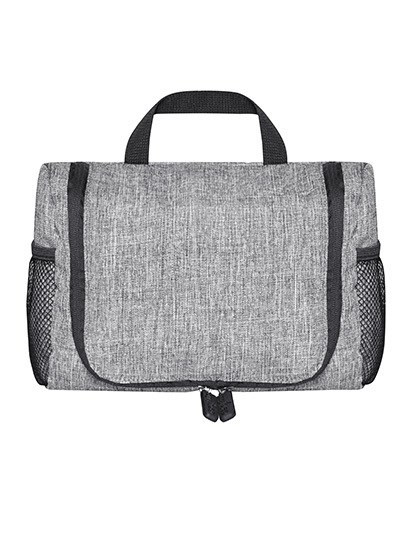 600D Polyester Kulturbeutel in Grey Melange | Ein Hauptfach mit langem 2-Wege-Reißverschluss in U-Form | Innen zwei Fächer mit Gummizug und ein Reißverschluss-Fach aus Air-Mesh im Umschlag | Metall-Haken am Umschlag innen zum Aufhängen nach dem Öffnen | Außen zwei Seitentaschen aus schwarzem Air-Mesh mit Gummizug | Obenliegende Trageschlaufe | Alle Reißverschlüsse in Schwarz, Gummi-Zipp-Puller mit „bags2GO“-Prägung | Volumen: ca. 6 Liter | Lieferung ohne Inhalt/Deko
