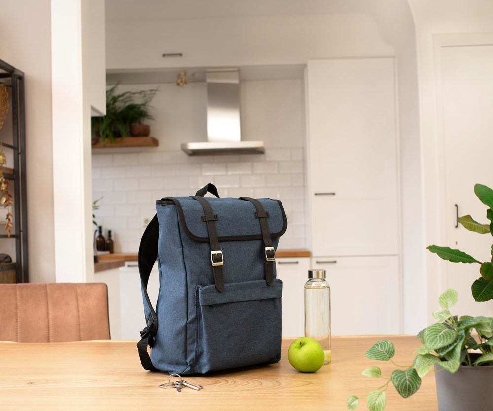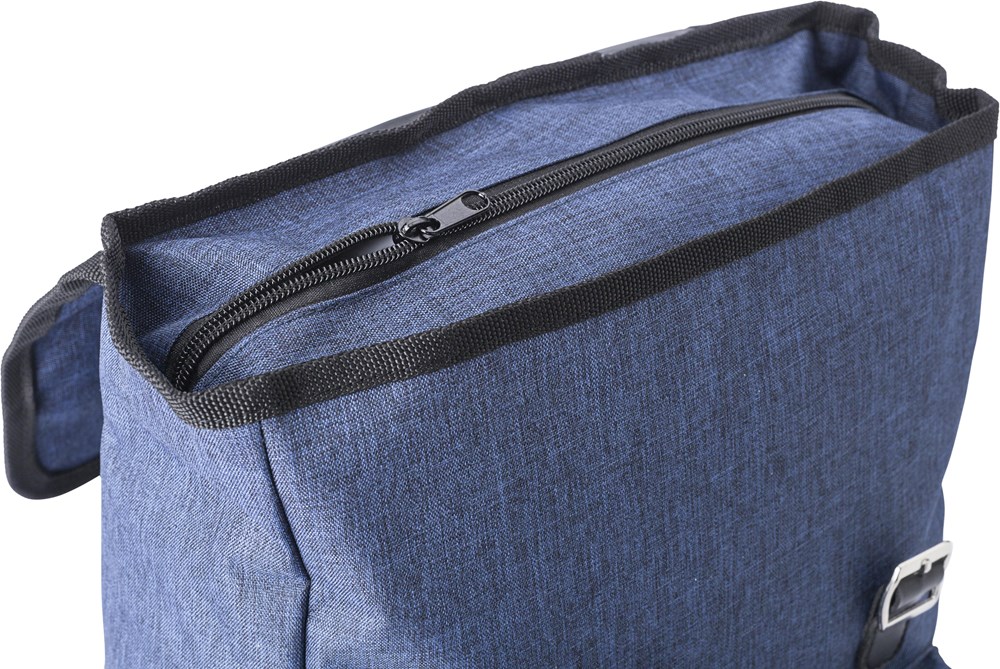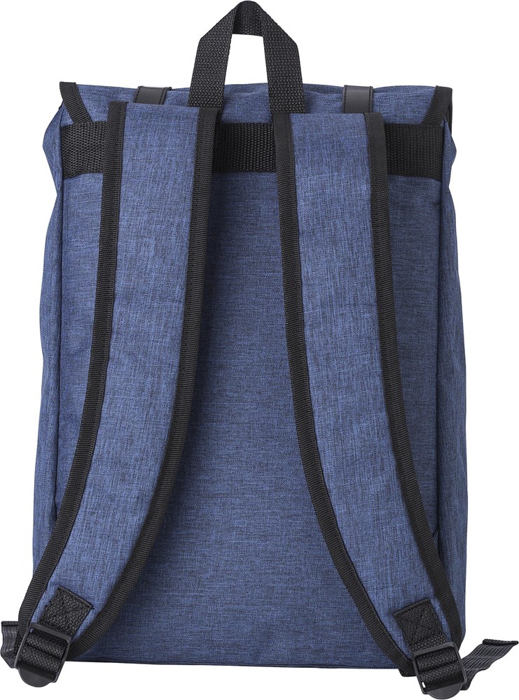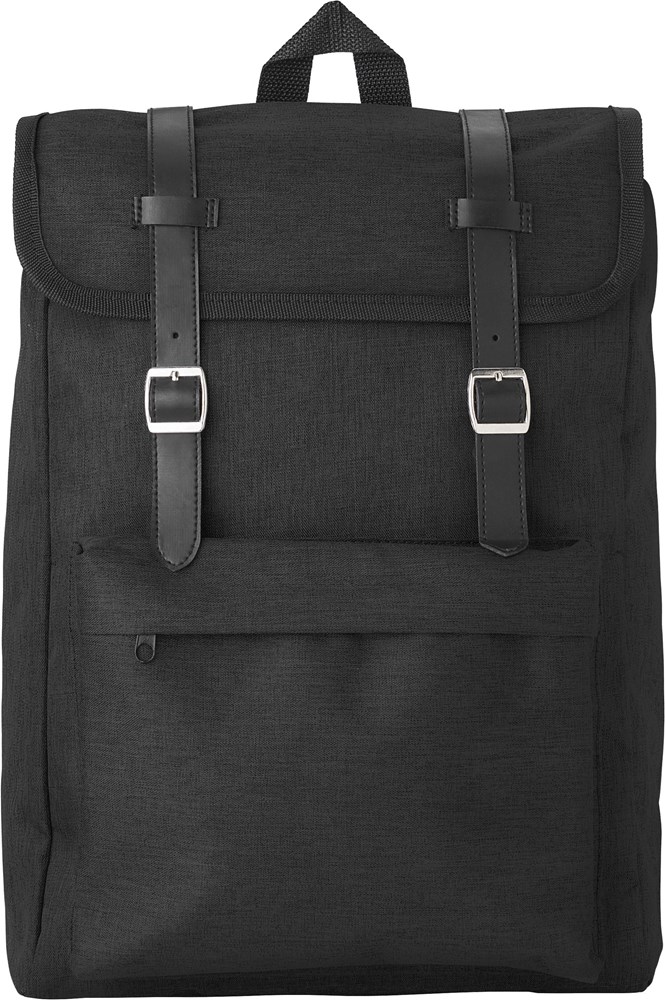 Rucksack aus Polyester (300D + 210D) mit Hauptfach und Vordertasche. Die Lasche wird mit zwei Schnallen verschlossen. Die Schultergurte sind gepolstert und verstellbar.