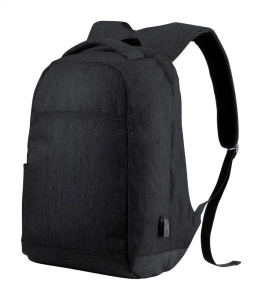 Anti-Diebstahl Rucksack mit mehreren Fächern, gepolstertem Laptop- (15") und Tabletfach (12"), gepolstertem Rücken und Schultergurten, Trolleygurt und eingebauter USB-Verbindung für Powerbanks. Material: 300D Polyester.