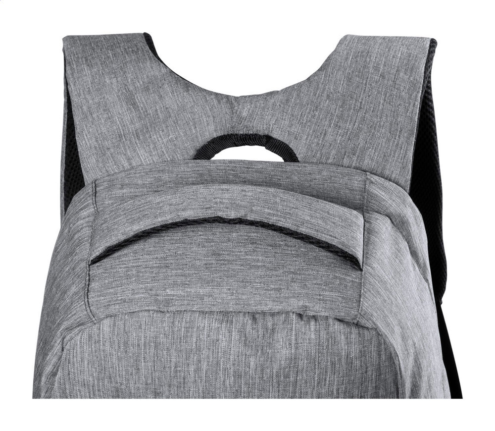 Anti-Diebstahl Rucksack mit mehreren Fächern, gepolstertem Laptop- (15") und Tabletfach (12"), gepolstertem Rücken und Schultergurten, Trolleygurt und eingebauter USB-Verbindung für Powerbanks. Material: 300D Polyester.