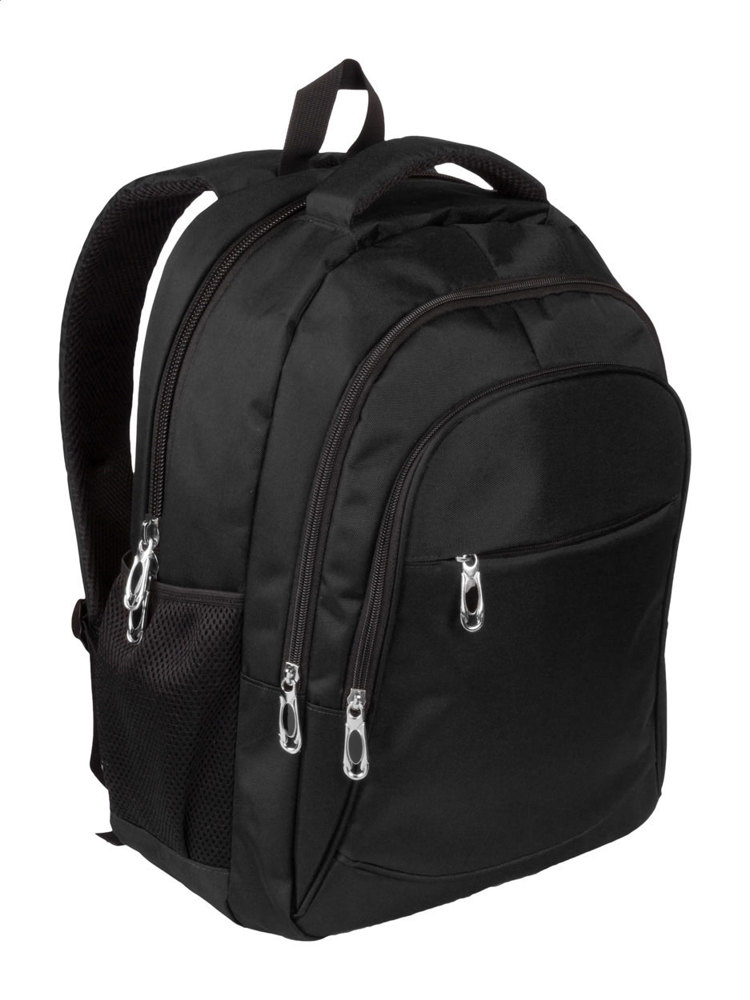 Rucksack aus 600D Nylon, mehrere Reißverschlusstaschen, Laptopfach (15"), Schultergurt.