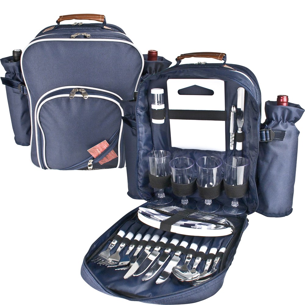 Picknickrucksack (vier Personen) + drei Kühleinheiten. Teller, Gläser, Besteck, Brettchen, Kellnermesser, Brotmesser sowie Salz- und Pfefferstreuer. Ihre Werbung drucken wir auf das Vorderfach.