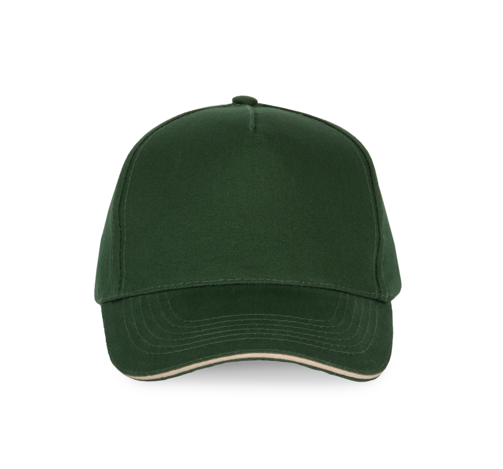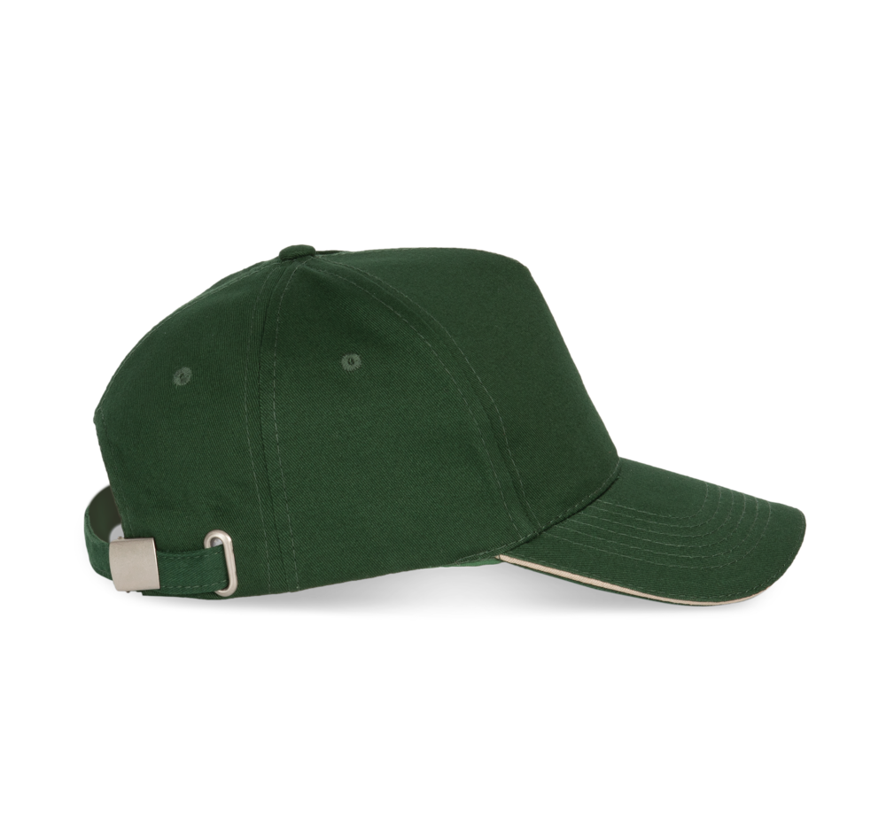 100% stark gebürstete Baumwolle. Laminierte 5-Panel-Kappe. Sandwichschirms mit kontrastfarbenem Mittelstück. Baumwoll-Schweißband. Größenverstellbar durch Metallschnalle.