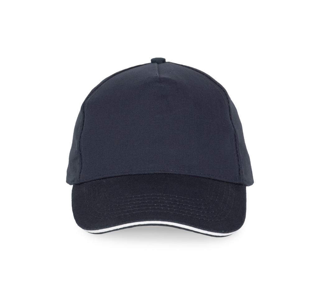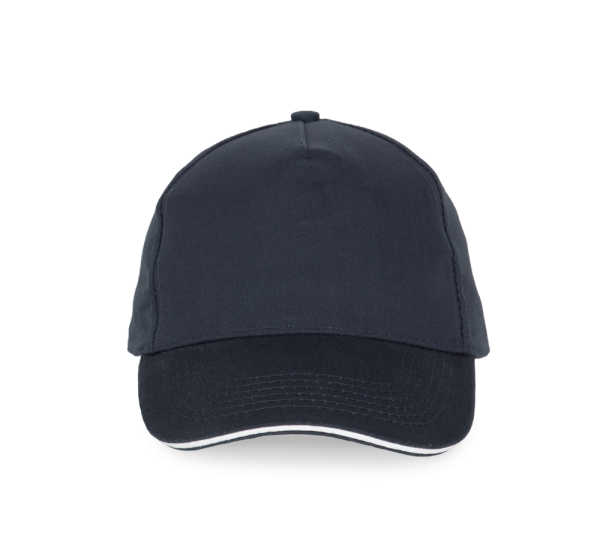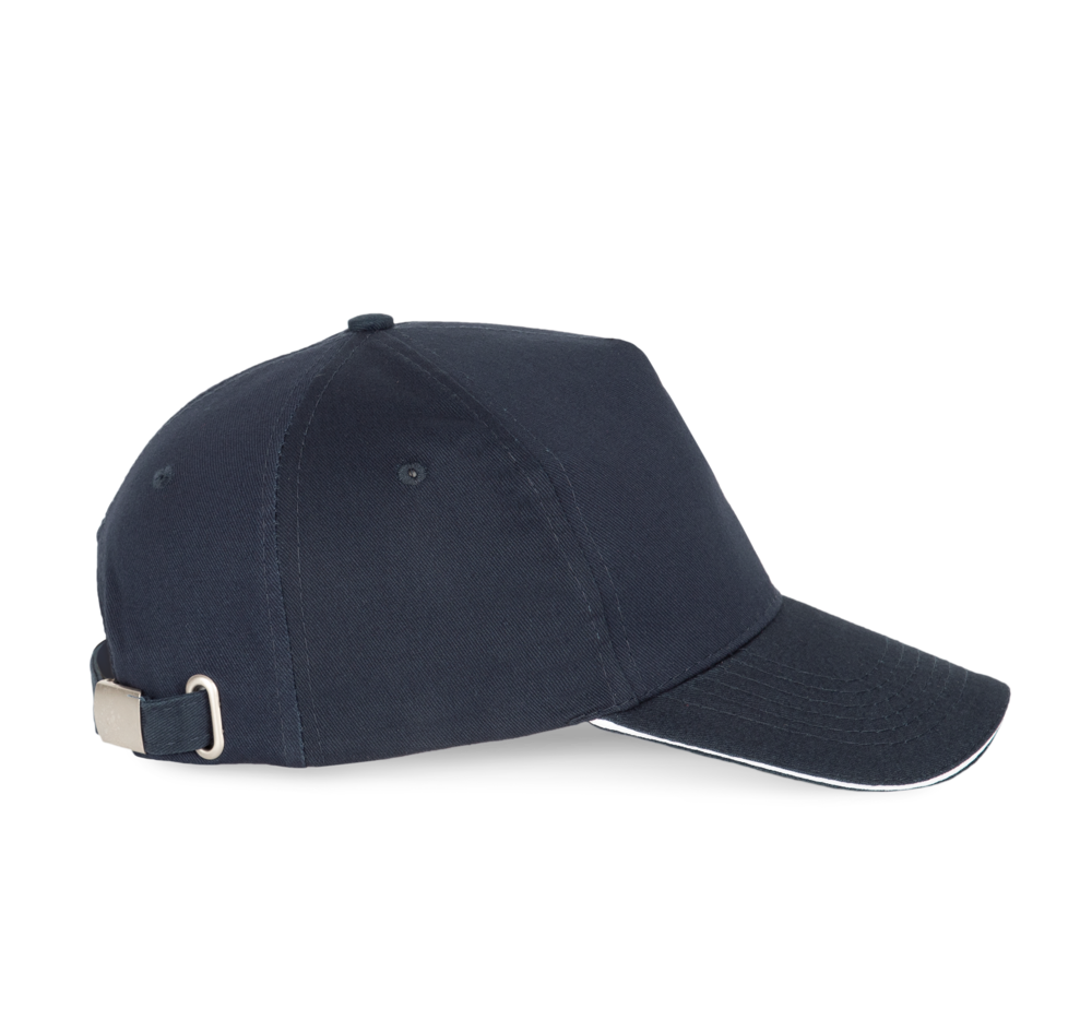 100% stark gebürstete Baumwolle. Laminierte 5-Panel-Kappe. Sandwichschirms mit kontrastfarbenem Mittelstück. Baumwoll-Schweißband. Größenverstellbar durch Metallschnalle.