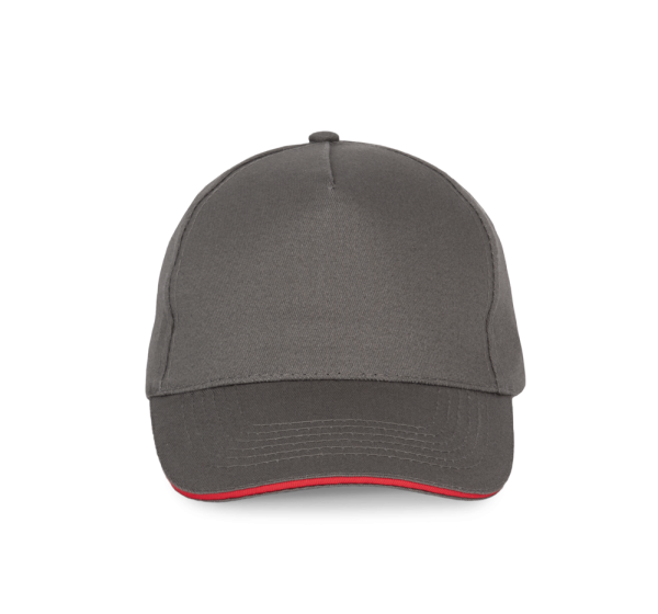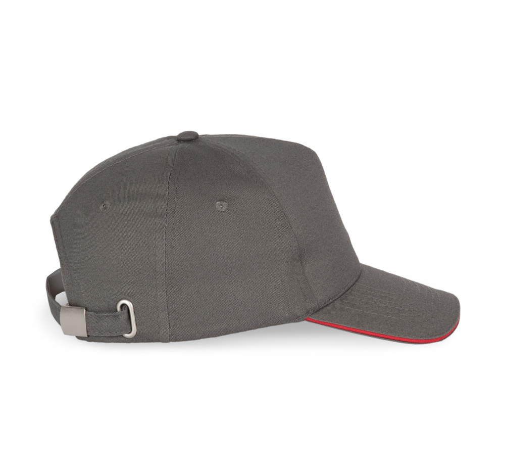 100% stark gebürstete Baumwolle. Laminierte 5-Panel-Kappe. Sandwichschirms mit kontrastfarbenem Mittelstück. Baumwoll-Schweißband. Größenverstellbar durch Metallschnalle.