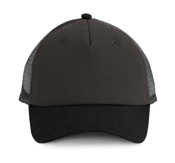 98% Bamwolle / 2% Polyester. 5-Panel-Kappe im Trucker-Stil. Frontpanel und Sonnenschutz-Visor aus Baumwollcanvas und Polyester-Netzstoff. Kunststoffriegel zur Weiteregulierung.