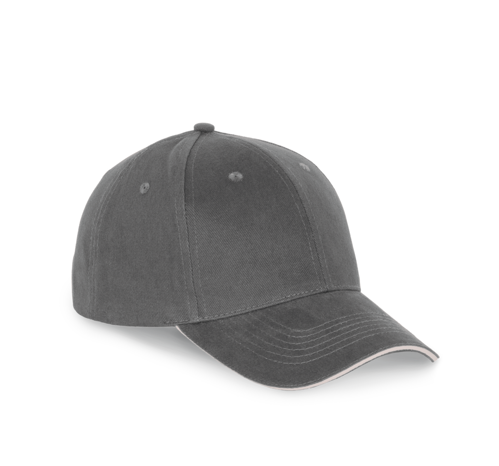 100 % Baumwolle. 6-Panel-Kappe mit Kontrast-Sandwichschirm. Über eine Metallschnalle verstellbarer Verschluss mit Schlaufe mit automatischer Bockierung.