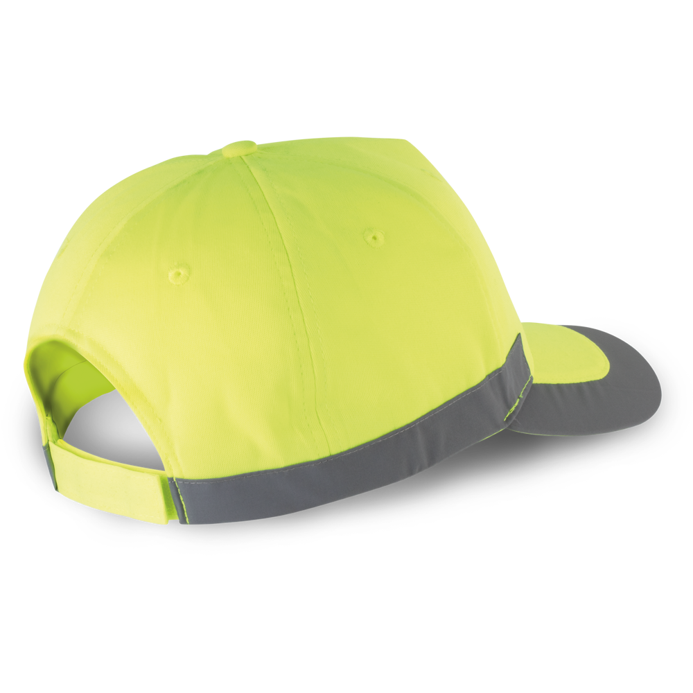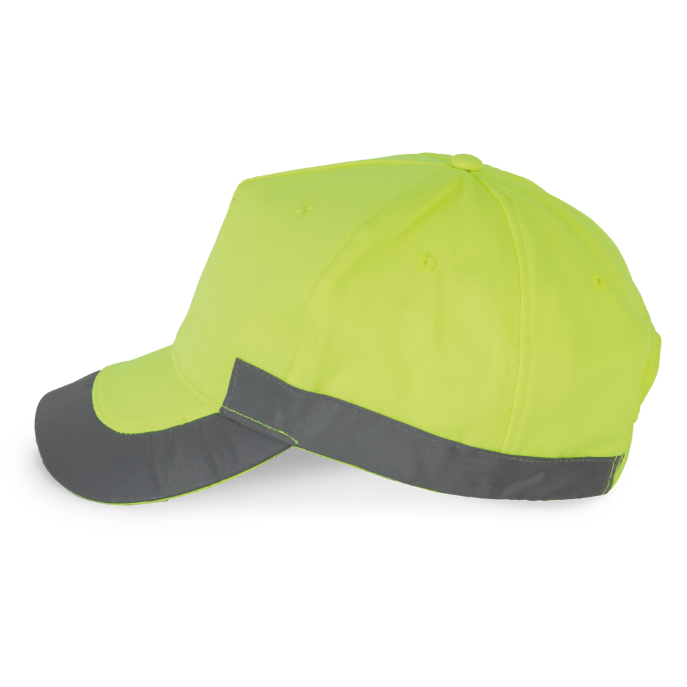 100% Polyester. 5-Panel-Kappe mit reflektierenden Elementen seitlich und am Schirm. Größeneinstellung mit Klettverschluss.