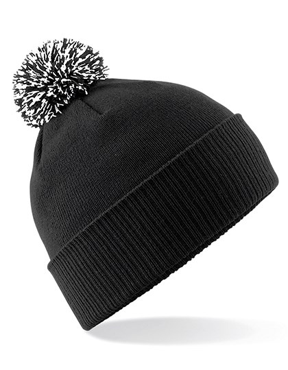 100% Soft-Touch Polyacryl | Doppellagiger Strick | Duales Design – mit Umschlag oder als Slouch-Beanie | 2-farbiger Bommel | Gerippter Ärmelabschluss | Abreißetikett für einfaches Rebranding