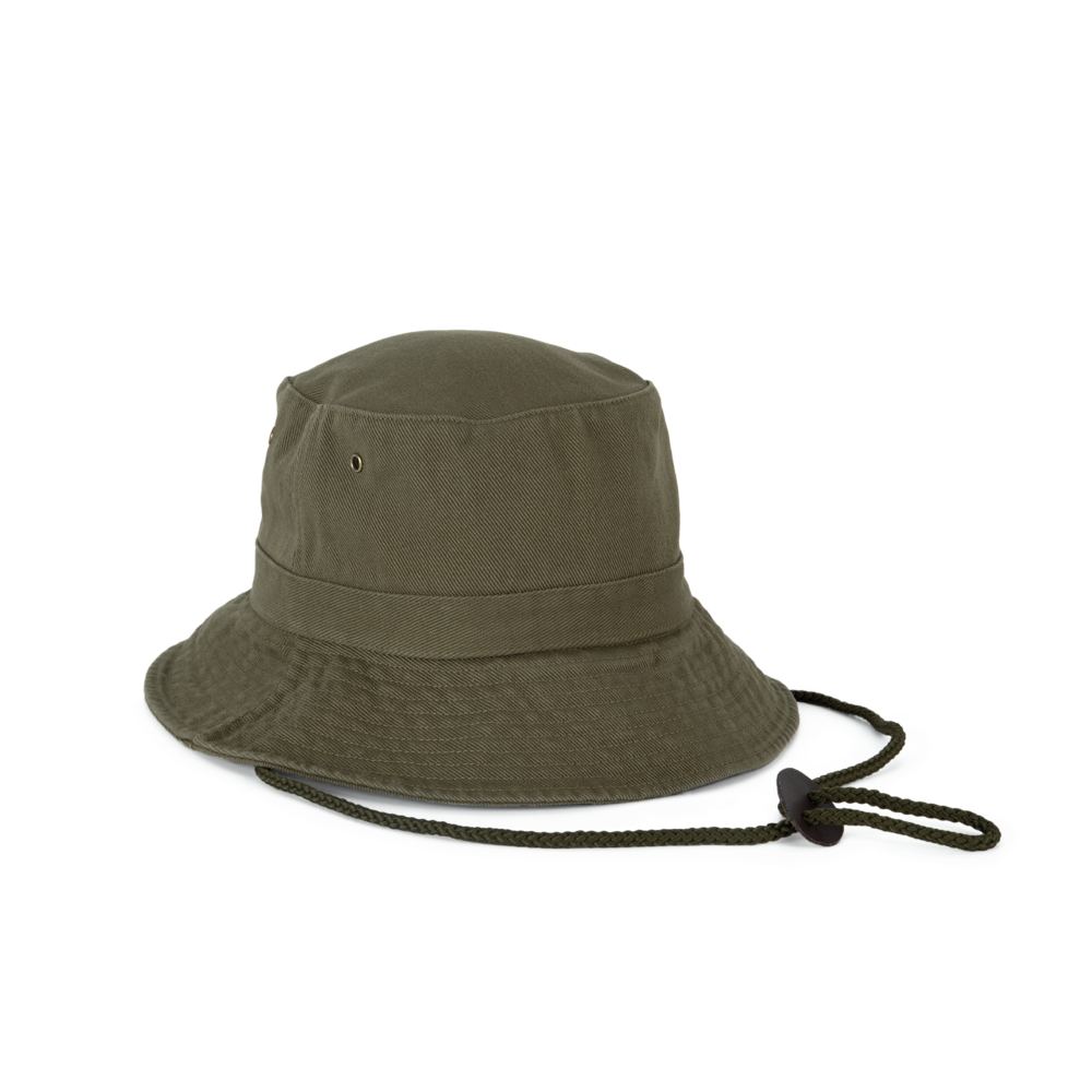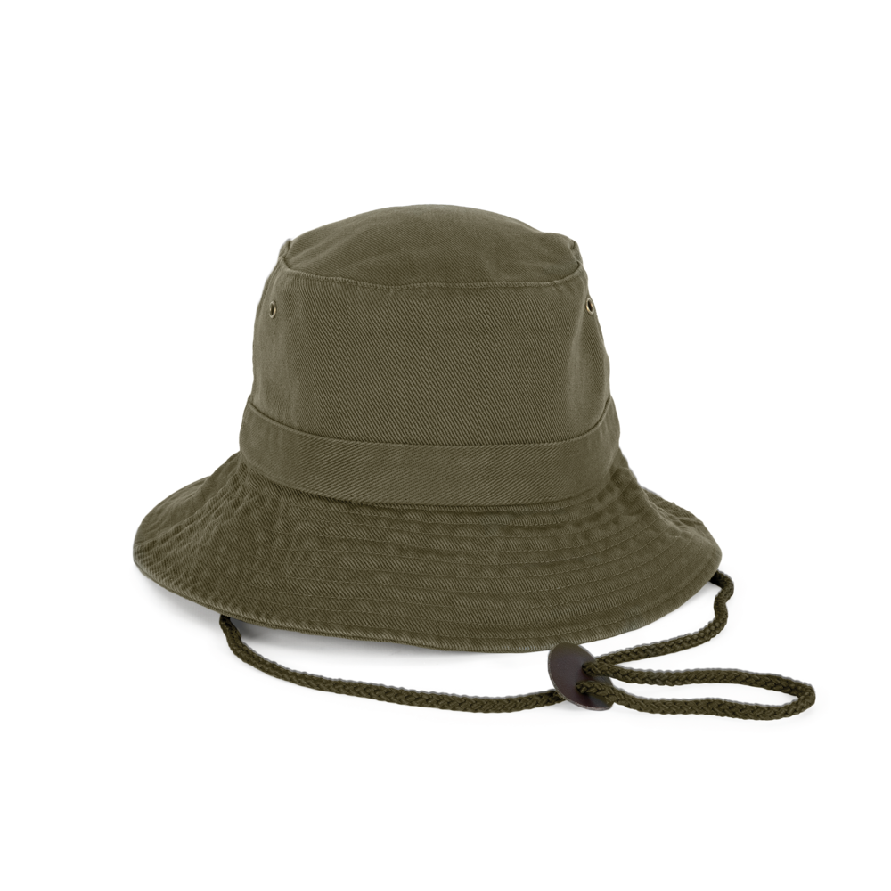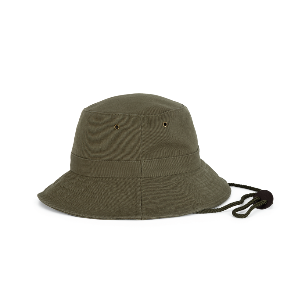 100% grob gebürstetes Baumwolltwill, fest und dicht. Doppelt gesteppter Rand. Krempe verstärkt. Schnur aus Leder, mit Stopper zum Einstellen. 4 Metall-Luftösen.
