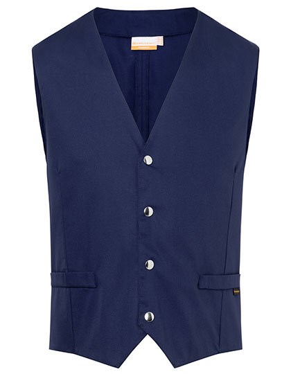 Köpergewebe, 215 g/m² | Hochveredelt, gekrumpft, waschecht, pflegeleicht | Herrenweste mit körpernaher Passform, Abnäher | Hinteres Taillenband durch Druckknöpfe verstellbar | 2 seitliche, imitierte Leistentaschen | 4 Druckknöpfe an Verschlussleiste | Industriewäschetauglich | Bis 95°C waschbar
