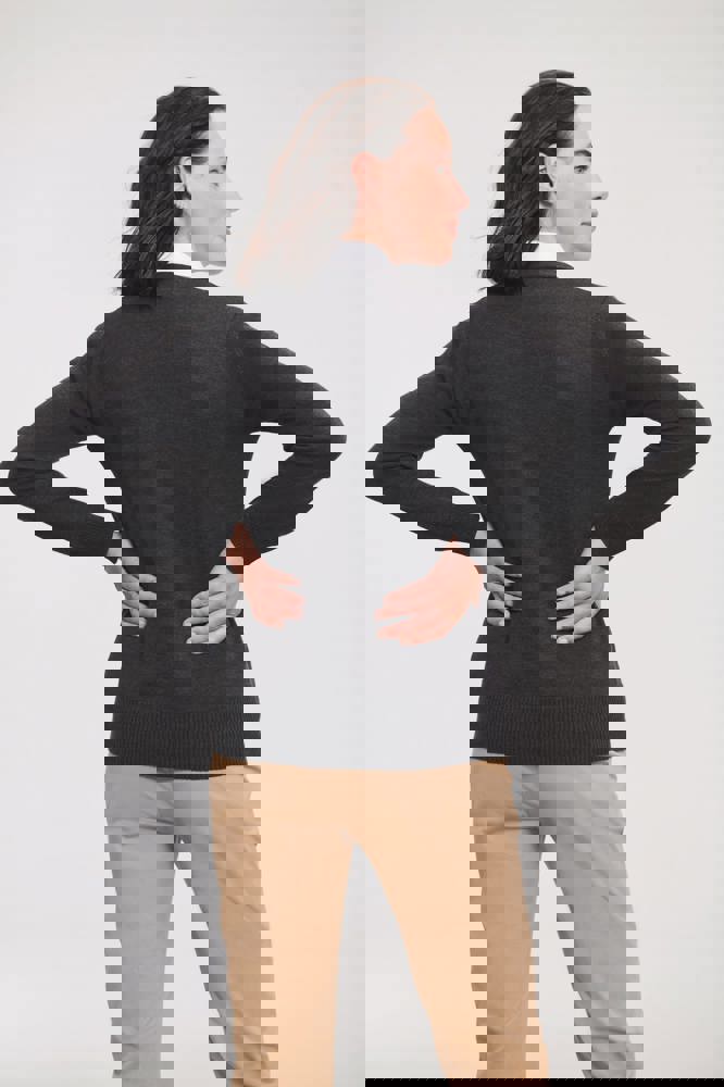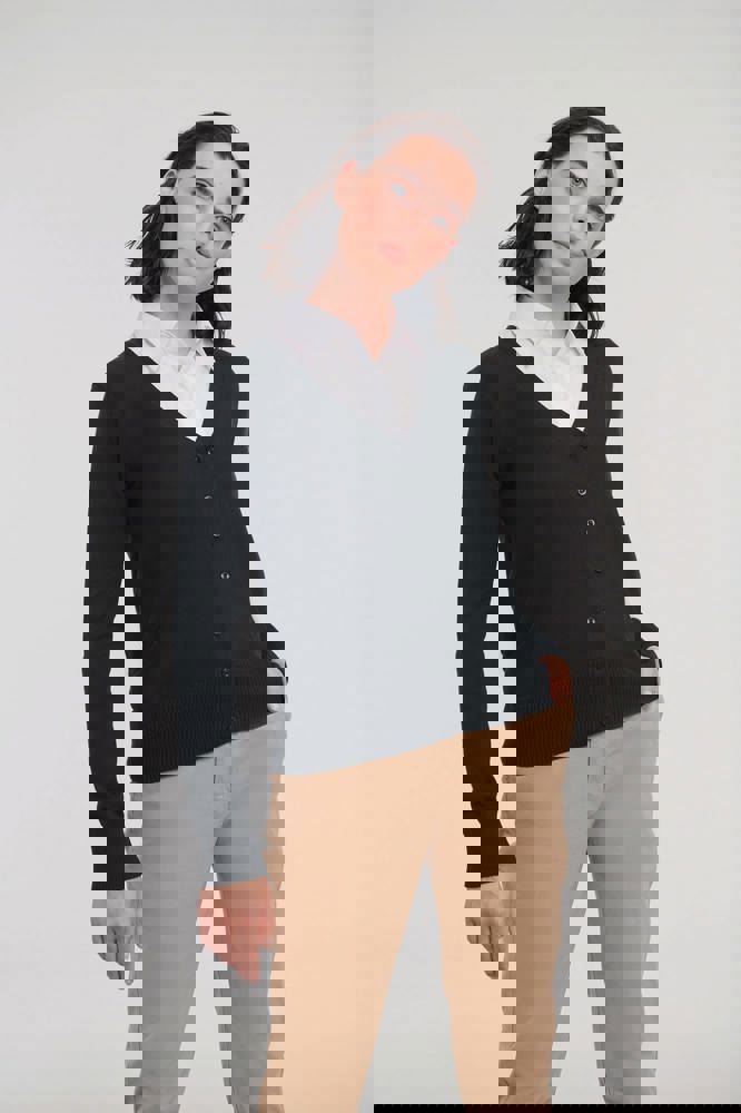 50% Baumwolle /50% Polyacryl. Pflegeleichtes CottonBlend Material. Glattgestrickt. V-Ausschnitt mit Rippstrickbündchen. Farblich abgestimmte Knöpfe. Ärmelabschluss und Bund mit breitem Rippstrickbündchen. Seitennähte.