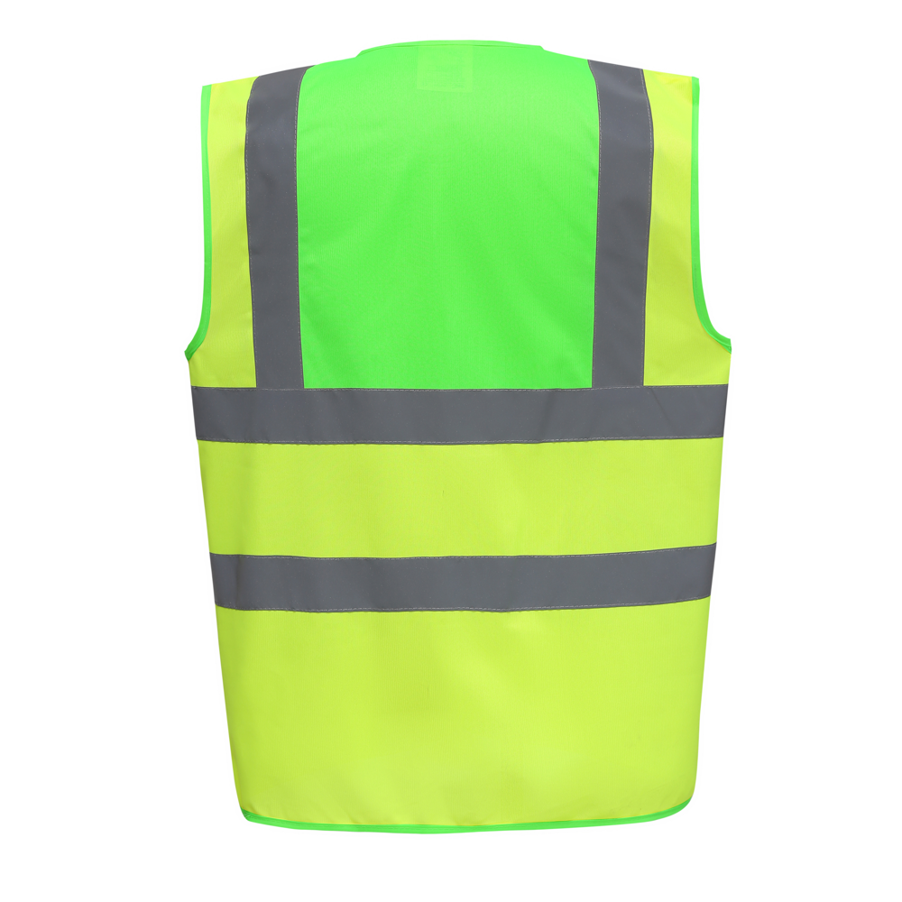 100% Polyester-Gewebe mit Klettverschluss. Zwei 5 cm breite Reflexstreifen um den Körper und einer über jeder Schulter. Hi-Vis Yellow, Hi Vis Orange, Orange/Hi Vis Yellow nach EN ISO20471: 2013 Klasse 2. Black/Hi Vis Yellow, Lime/Hi Vis Yellow, Navy/Hi Vis Yellow, Purple/Hi Vis Yellow, Paramedic Green/Hi Vis Yellow, Red/Hi Vis Yellow, Raspberry/Hi Vis Yellow, Royal Blue/Hi-Vis Yellow gemäß EN ISO20471: 2013 Klasse 1.