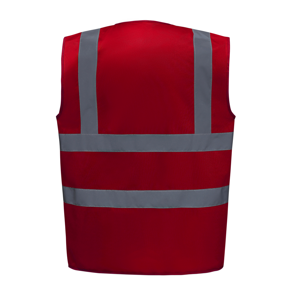 100% Polyester-Gewebe mit Klettverschluss. Zwei 5 cm breite Reflexstreifen um den Körper und einer über jeder Schulter. Hi-Vis Yellow, Hi Vis Orange, Orange/Hi Vis Yellow nach EN ISO20471: 2013 Klasse 2. Black/Hi Vis Yellow, Lime/Hi Vis Yellow, Navy/Hi Vis Yellow, Purple/Hi Vis Yellow, Paramedic Green/Hi Vis Yellow, Red/Hi Vis Yellow, Raspberry/Hi Vis Yellow, Royal Blue/Hi-Vis Yellow gemäß EN ISO20471: 2013 Klasse 1.